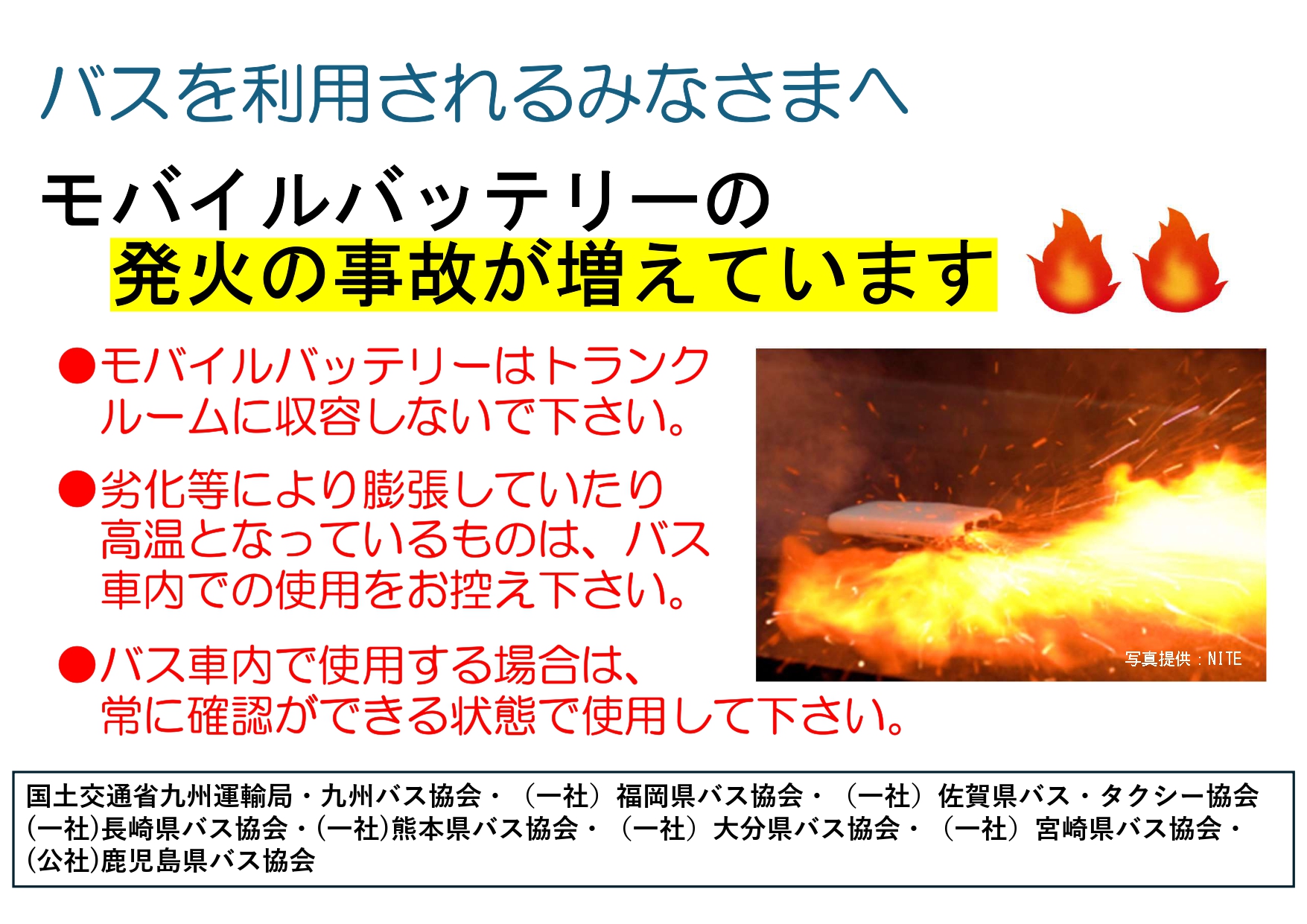 バス車内でのモバイルバッテリーの持ち込み・使用に関しましては、発煙・発火等の事故防止のため、以下の点にご協力をお願いいたします。
