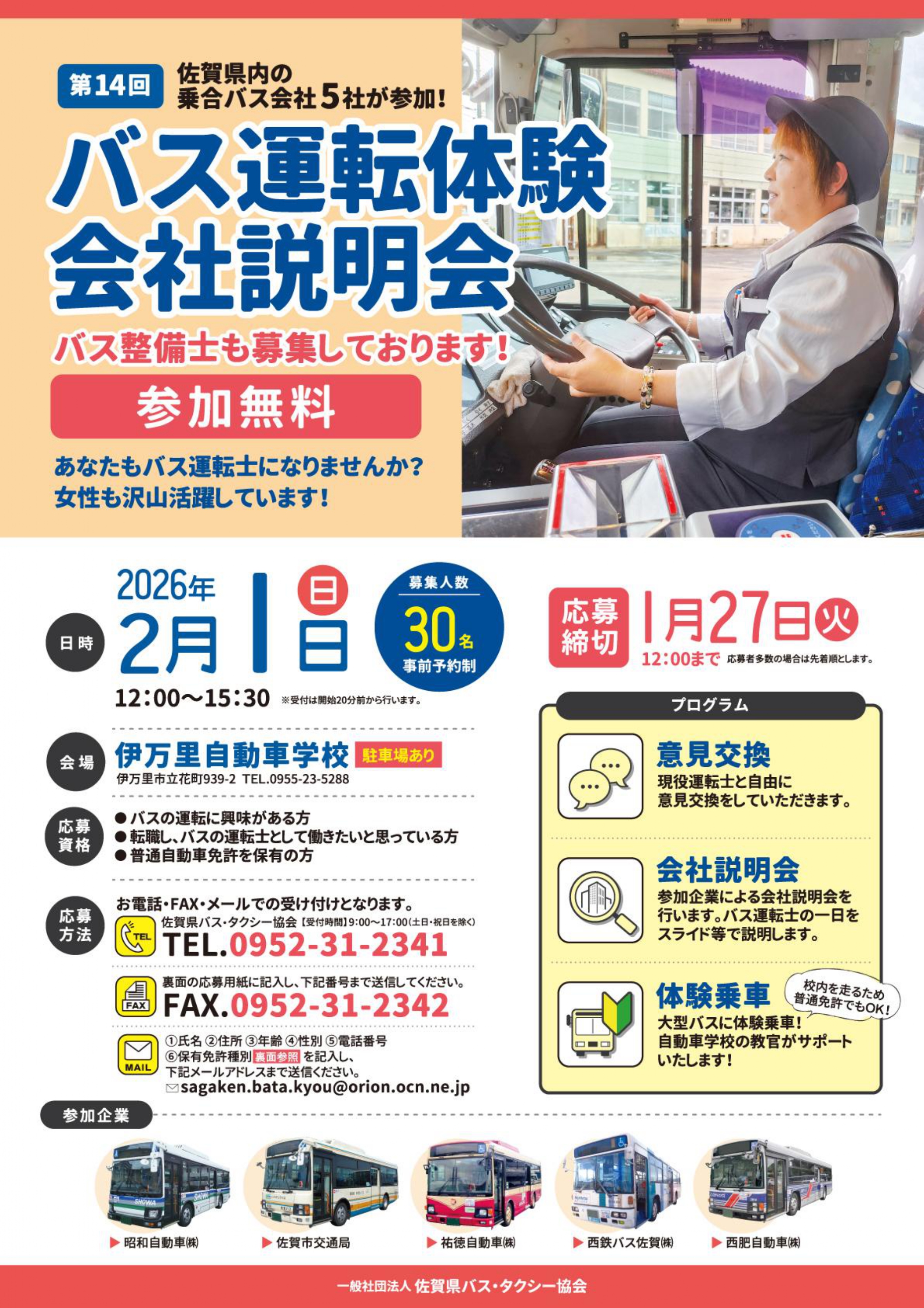 佐賀県バス・タクシー協会と県内の路線バス事業者5社の共催で「バス運転体験・会社説明会」を下記の通り実施します。