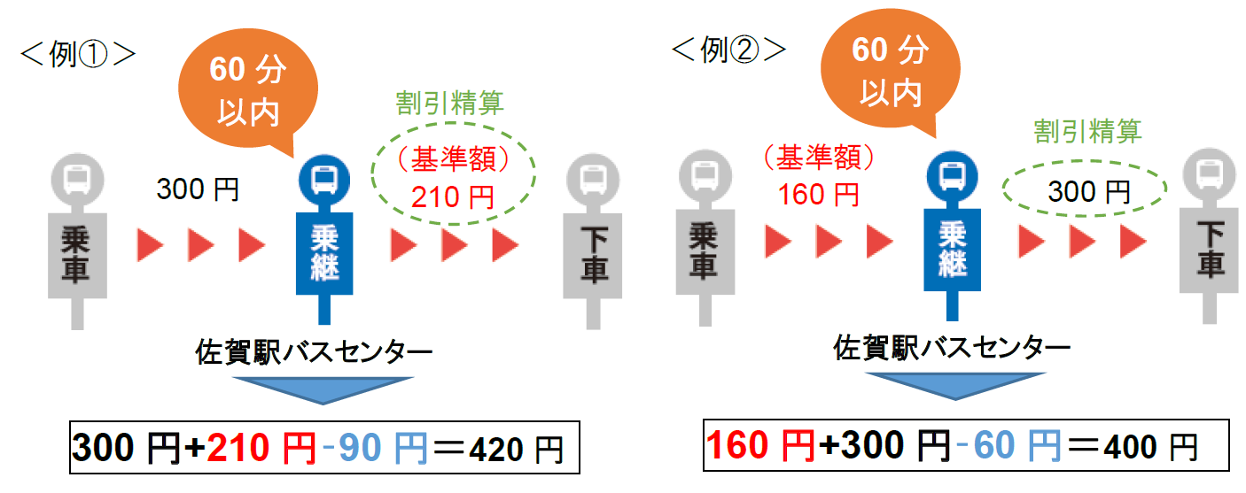【変更後】60分以内に1回乗り継ぐごとに最大90円割引(佐賀市営バス、西鉄バス、昭和バス、祐徳バス間)