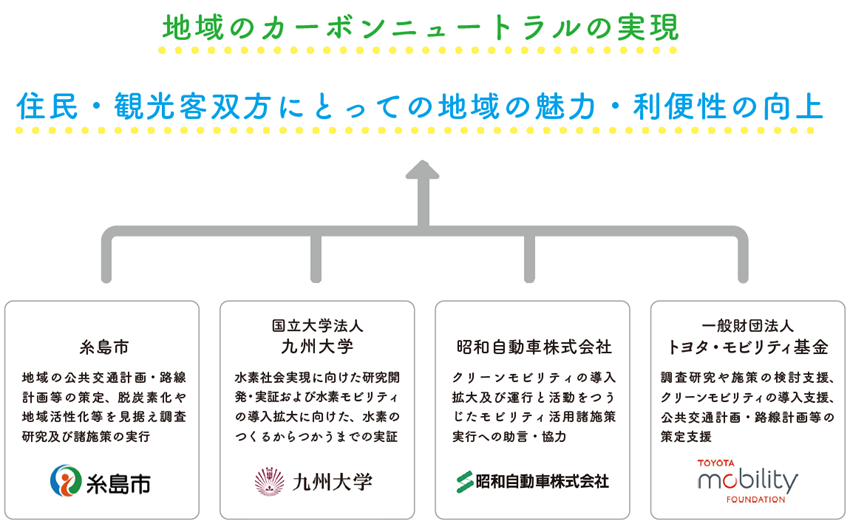 このたび昭和自動車株式会社は、一般財団法人トヨタ・モビリティ基金、糸島市、国立大学法人九州大学と4者で、カーボンニュートラルの実現と地域の交通課題の解決を目指し、2026年3月23日に連携協定を締結しました。今後、地域の交通課題の解決と、カーボンニュートラルに資するクリーンモビリティの実装などに取り組み、糸島半島エリアの豊かな自然と共生するモビリティ社会の実現を目指します。