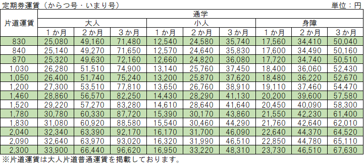 但し、740円以上の区間のみ適用されます。からつ号、いまり号の運賃表は定期券金額早見表を下にスクロールしてご覧ください。