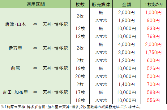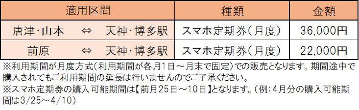 からつ号(唐津~福岡線)、いまり号(伊万里~福岡線)のみ適用される往復定期券の金額をご確認いただけます(片道定期券は半額 ※10円未満は切り上げ)。
